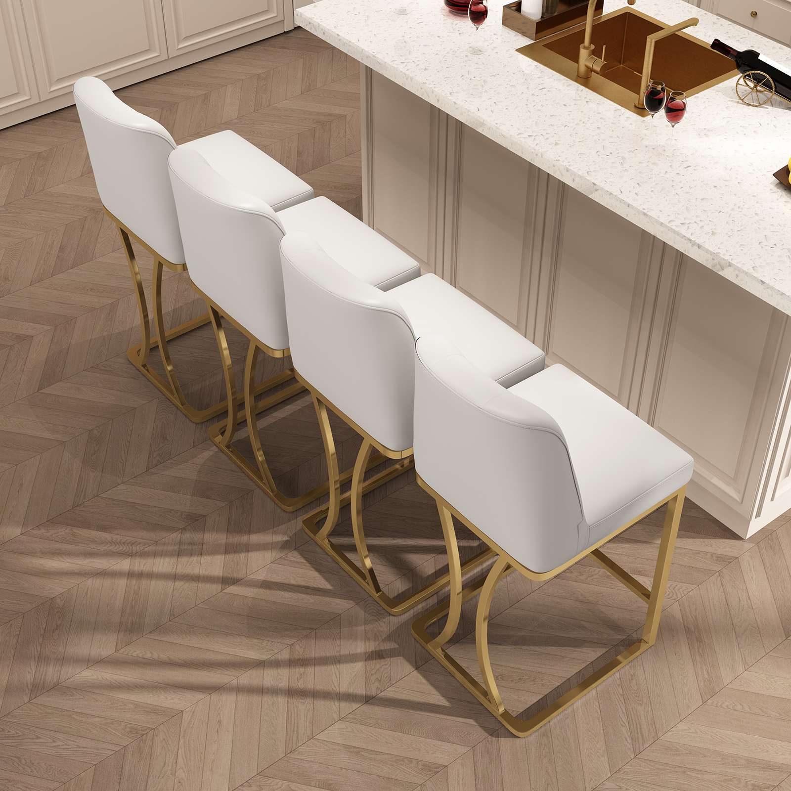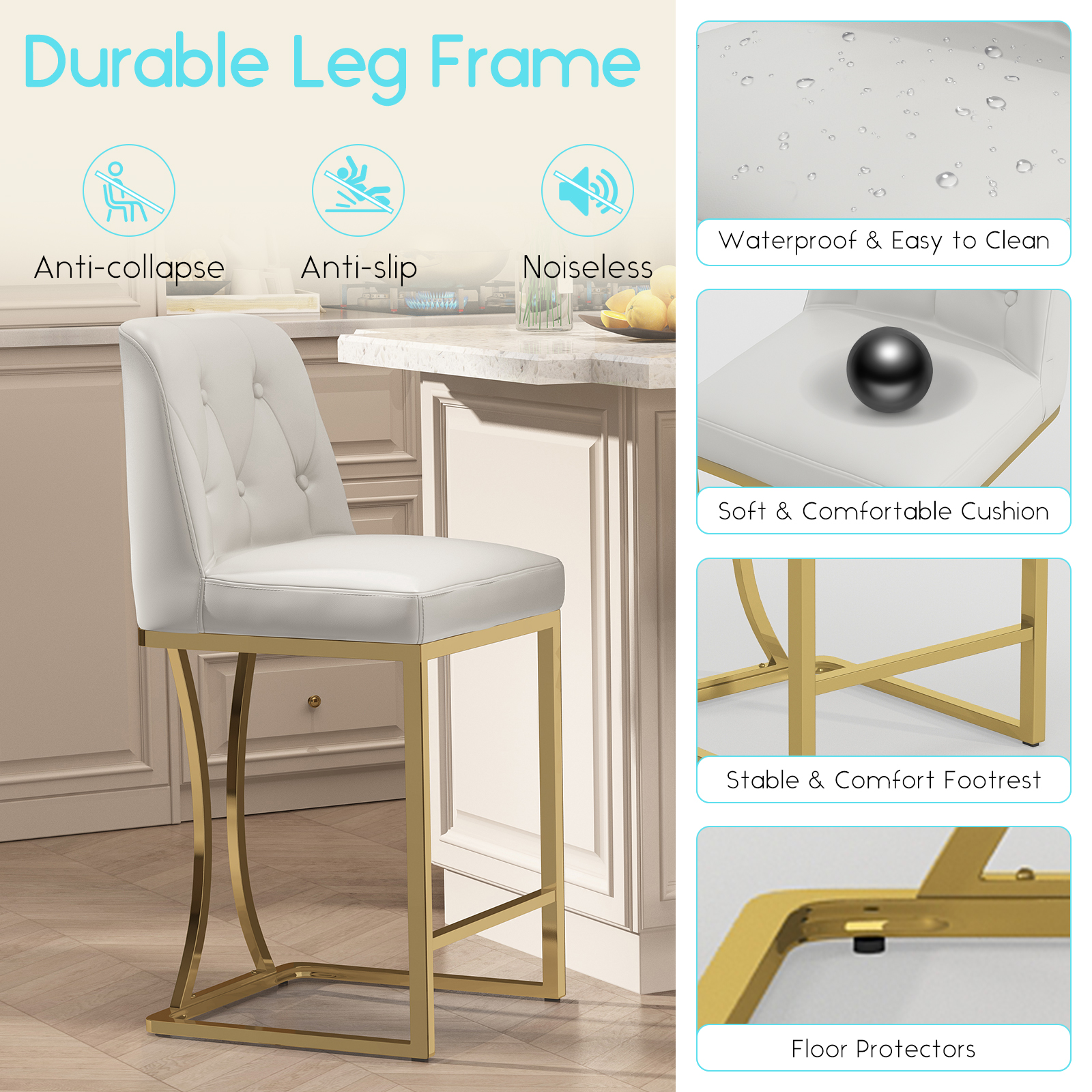 Ollega 24″ bar stools feature PU leather seats with soft padding, a sturdy metal frame, and foot pads for stability. Designed for 24″ counter height with a built-in footrest, they support up to 300 lbs. Ideal for kitchens, bars, and dining areas. Easy to assemble with included instructions.