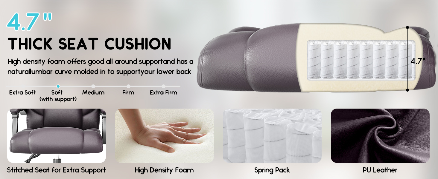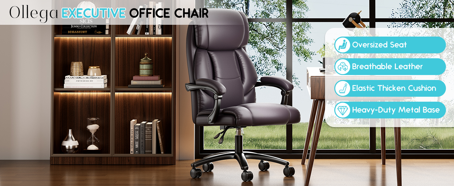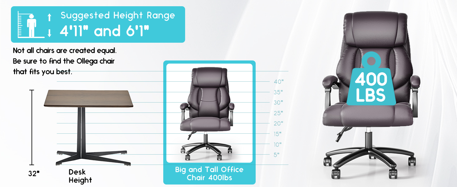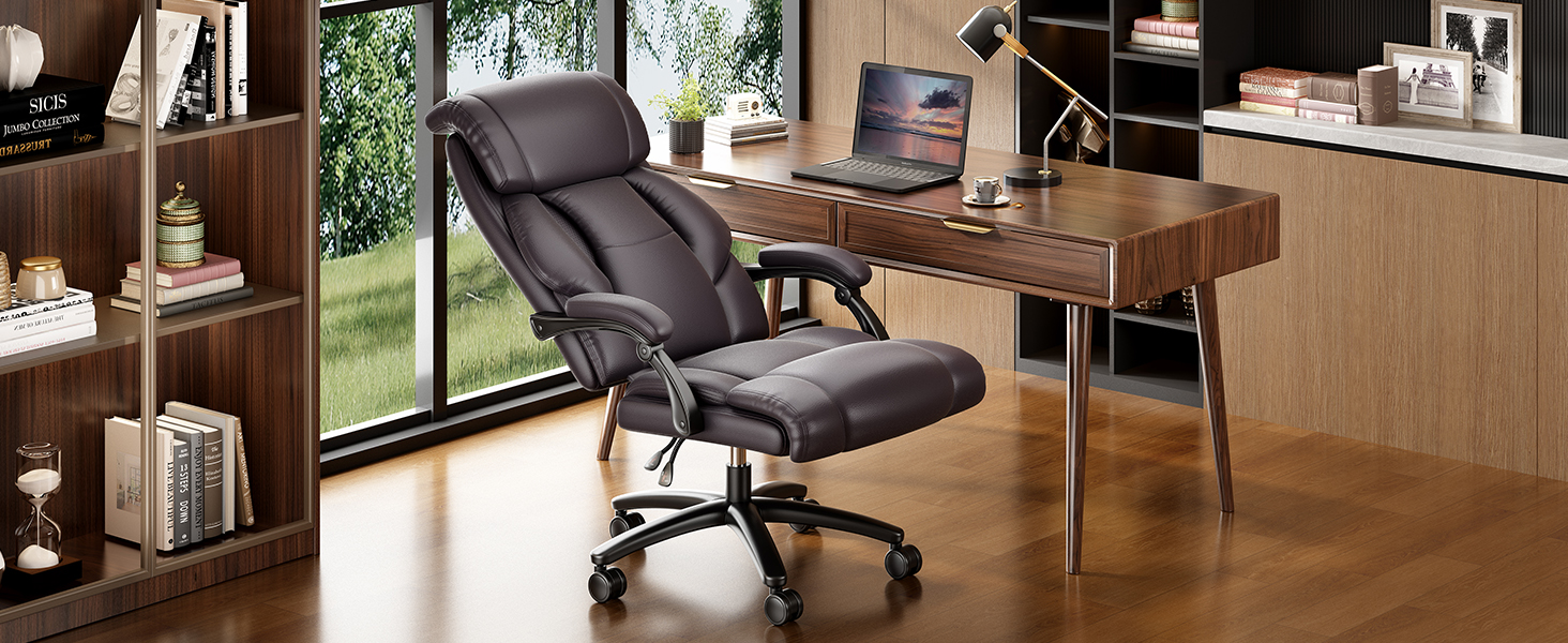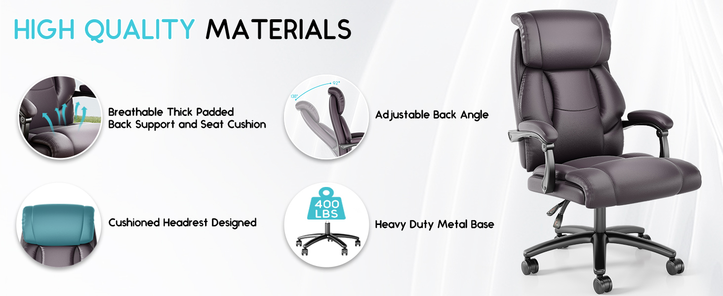 Adjustable high-back office chair reclines 92°-138° with height adjustment and thick armrests for comfort. Supports up to 400 lbs with a sturdy metal base and oversized cushion. Ergonomic design with a wide backrest and headrest ensures lasting support. 360° swivel wheels and a durable frame provide stability.